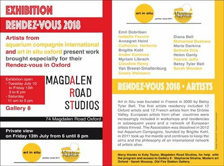 Art in Situ was founded in France in 2000 by Betsy Tyler-Bell. The first residency included 12 Oxford artists and 12 French artists from the Drome Valley. European artists from other countries were increasingly included in workshops and residencies in subsequent years and a network of European artists thrived. The Association was dissolved in 2012 but Aquarium Compagnie, founded by Brigitte Kohl in 2011, took up the mantle and continues to keep the aims and the philosophy of an international network of artists alive.