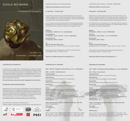 The exhibition will be enlivened by a series of (music) performances, all of them taking place at the exhibition venue (Villa P651) on 27 November 2018. These performances aim to pay tribute to three deceased composers with whom Gisela Weimann collaborated many times: the Polish composer Witold Szalonek, the American soloist and pioneer of electronic art music Pauline Oliveros and the German avant-garde composer and trombonist Friedrich Schenker. A recording of Szalonek’s music and Oliveros‘ and Schenker’s experimental compositions will be presented alongside recent works by two contemporaries: Berlin-based Japanese Mayako Kubo, one of the most prominent contemporary Japanese composers, and the young Czech composer Martin Klusák.