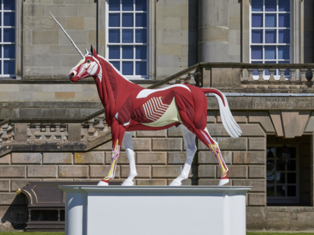 Outside The Weston, Myth (2010) presents a white unicorn with half of its skin flayed to reveal vibrant red, pink and yellow musculature and tissues. Hirst often takes religious or mythical figures as his subjects, unpicking and disrupting their familiar narratives. Horses have been an artistic subject for millennia and, referencing this tradition, Hirst’s unicorn stands high on a classical plinth. Like all works in this display, Myth makes a playful nod to art history.