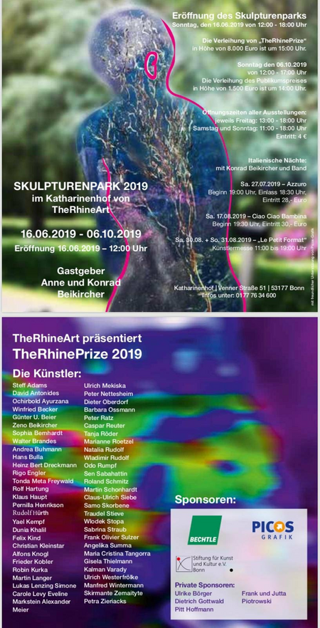 54 international bekannte Künstler-Bildhauer präsentieren jeweils eine Ihrer aktuellen Arbeiten (Skulptur) auf einem spannenden Wald -Wiesen Ausstellungsgelände am Stadtrand von Bonn-Bad Godesberg. Von einer renomierten Jury, besetzt mit zwei Museumsdirektoren werden wie jedes Jahr eine Arbeit mit dem TheRhinePrize ausgezeichnet.