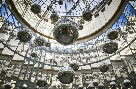 For the exhibition CA.CA. John M Armleder created an installation in the freely accessible Rotunda of the Schirn. 20 disco balls mounted at different heights are multiplied in its windows covered with mirror film. Inside the Schirn, he assembled further works and installations, including new "Pour Paintings," wall paintings of stylized skulls and sculptures such as an inverted double children’s slide that forms part of his "Furniture Sculptures."Â