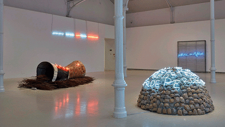 Merz’s practice, linked to Arte Povera, incorporates different key characteristics that the coetaneous art critic Germano Celant identified with this movement: in addition to its opposition to the post-industrial society of consumerism, we find a conscious use of organic materials such as clay, branches, wax and coal. From the application of these materials stem some of the recurring associations in the pre-modern imagery of the artist, for instance fire, lightning bolts and arrows; figures with mythical and geological meanings – the igloo, the table, the spiral, the river; or ancestral animals like the rhinoceros and the crocodile. These motifs, coupled with the idea of the nomad, run through the breadth of the artist’s poetics, vindicating lifestyles in consonance with nature that resist the predatory schemes of capitalist modernity. Thus, the search for mythology distinguished Merz’s work from his kindred contemporaries, for his archaism bore no relation to a melancholic yearning for the past, but instead was related to a razor-sharp critique of industrial and consumerist modernity.