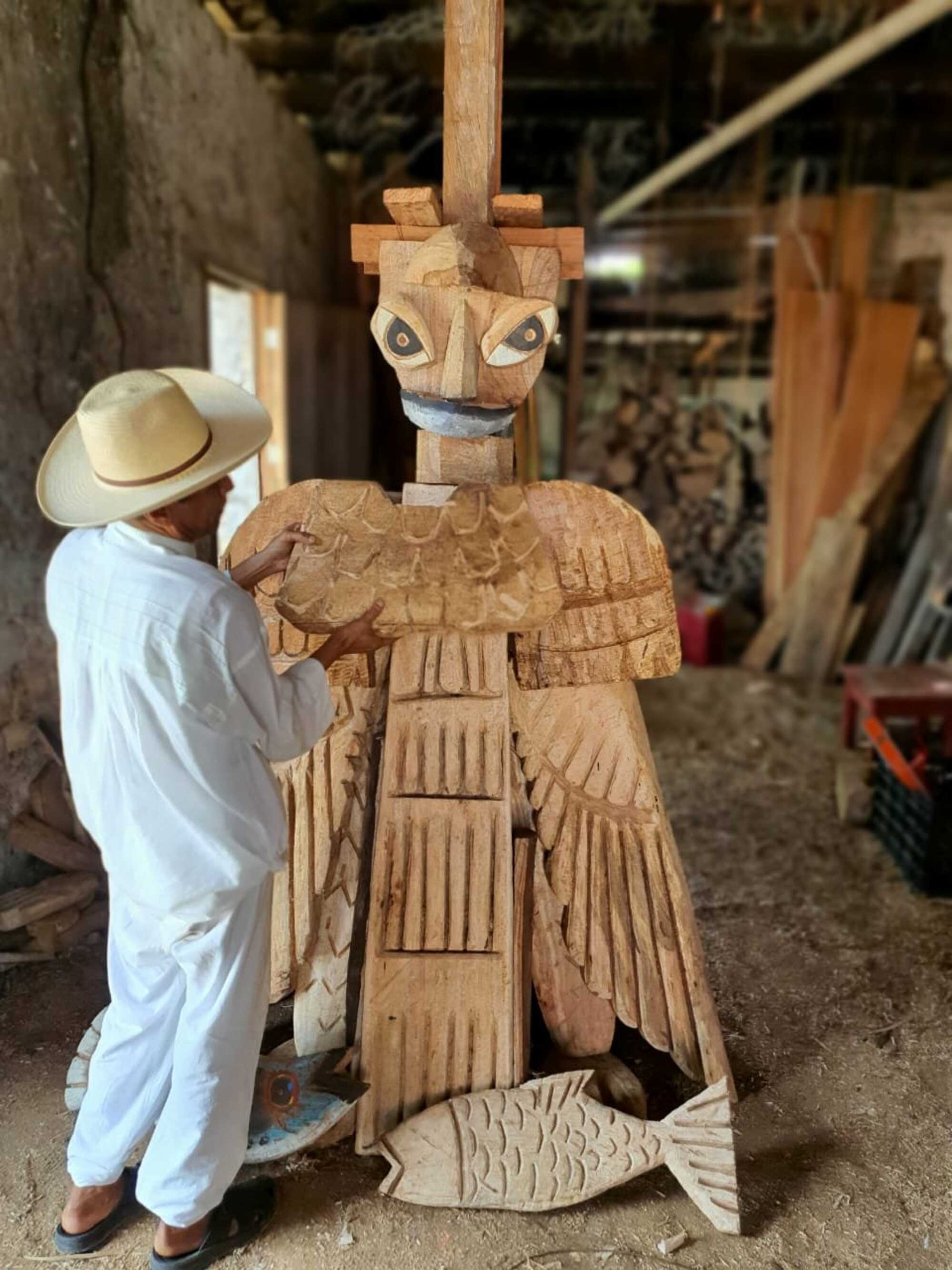 In Chumatlán, Veracruz, México a 4.5m high totem is carved from a single tree during a ceremony to thank it for giving its life. The head of a man and the wings of an eagle are sculpted into the cedar wood, the chiselled lines imprinting a message that will stretch 9000km from Mexico to London.