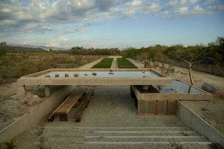 Fundación Casa Wabi is an interdisciplinary project whose mission is to promote the exchange of ideas, fostering an open and constructive dialogue between national and international artists in a variety of practices and disciplines. The foundation is based in Puerto Escondido, on the Pacific coast of Oaxaca, 800km south of Mexico City. Set between the mountains and the sea, the foundation and its grounds were designed by Japanese architect Tadao Ando. Founded in 2014 by Mexican artist Bosco Sodi, its facilities include a multipurpose room, six studio-dorms and a 50-acre sculpture garden, as well as two recently opened pavilions: the Clay Pavilion by Alvaro Siza (Pritzker, 1995) and the Guayacan Pavilion by Mexican studio Ambrosi-Etchegaray.