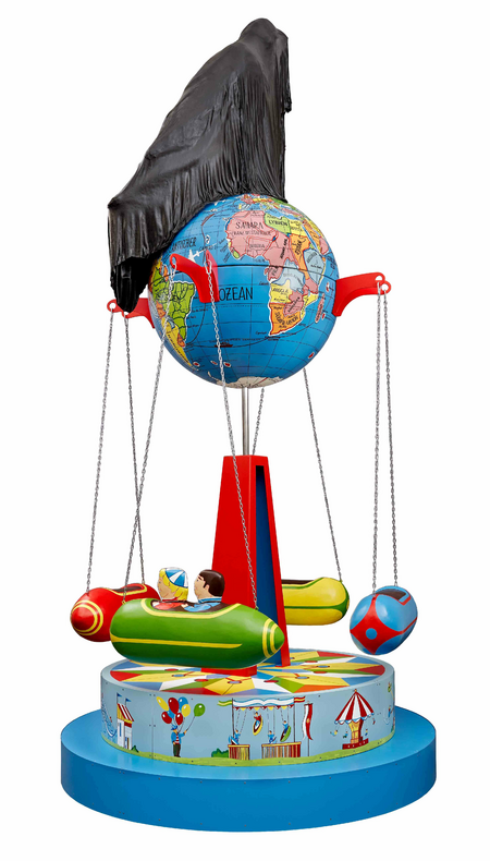 Children's eyes begin to sparkle and adults also consistently associate positive feelings with it - a carousel. Peter Riss's installation The Carousel (2017) initially arouses exclusively positive emotions in the viewer. A round, two-storey platform, decorated with colorful fairground motifs, connected by a red two-legged pillar, supports an oversized globe with attached arms that in turn carry gondolas which are attached by means of chains. In one of the gondolas there are even two people - one might even assume it is a father with his child. The merry-go-round is decorated in complementary colors and thus looks very simple and bright. The delicate light blue of the carousel, which is used extensively in the background, is particularly dominant. This reinforces the positive feelings with a sense of calm ... if there were not - sitting on the center of the globe - an oversized bird figure, which itself seems threatening. But that is not all, the threat is further intensified by the fact that this figure is wrapped in a black cloth. Black of all colors - a color that we mainly associate with death, darkness, ruin and disease. Thus our beautiful, cheerful, colorful world is destroyed in one fell swoop and we are left with feelings of doubt, malaise and even fear.