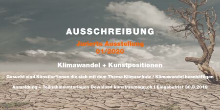 Die Galerie Kunstraum Egg schreibt das Ausstellungsprojekt „Klimawandel + Kunstpositionen“ aus. Gesucht werden Kunstschaffende – idealerweise Bildende Kunst – die sich in ihrer Arbeit mit der Thematik beschäftigen. Gefragt sind Visionen, Fakten, mögliche Szenarien, Konzepte. Ob Treibhausgase, Verschmutzung der Meere, das Artensterben oder Monokulturen – alle sind sie Realitäten unserer Zeit und haben schädliche Auswirkungen auf den Planeten Erde, die Natur und auf uns Menschen, die bleibend und kaum rückgängig zu machen sind. Das Feld ist weit und offen. Die Ausstellung erhebt keinen Anspruch auf Vollständigkeit – das würde den Rahmen der Galerie sprengen. Wir berücksichtigen v.a. Ideen, die sensibilisieren, drängende Fragen und (unbekannte) Zusammenhänge visualisieren und zu konstruktiven Denkanstössen anregen.