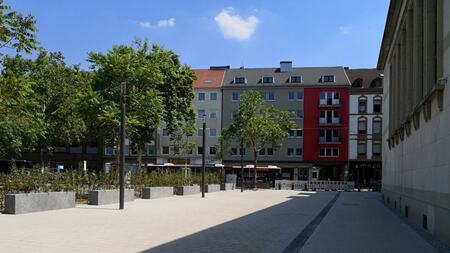 Auf dem Synagogenvorplatz steht eine klar definierte Fläche für die Gestaltung zur Verfügung. Eine Einbeziehung der Steinbekleidung der Fassade der Synagoge ist nach denkmalrechtlicher Einschätzung möglich. Vis à vis bildet eine Reihe von Betonbänken die massive Abgrenzung zum Beethovenplatz. Eine Überformung ist hier zulässig.