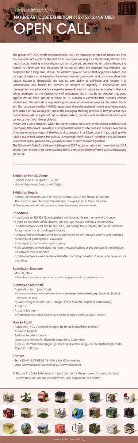 - Location to send the work: Nature Art Cube Exhibition of Geumgang Nature Art Biennale (32530) 98 Yeonmisangogae-gil, Useong-myeon, Gongju-si, Chungcheongnam-do, Republic of Korea
